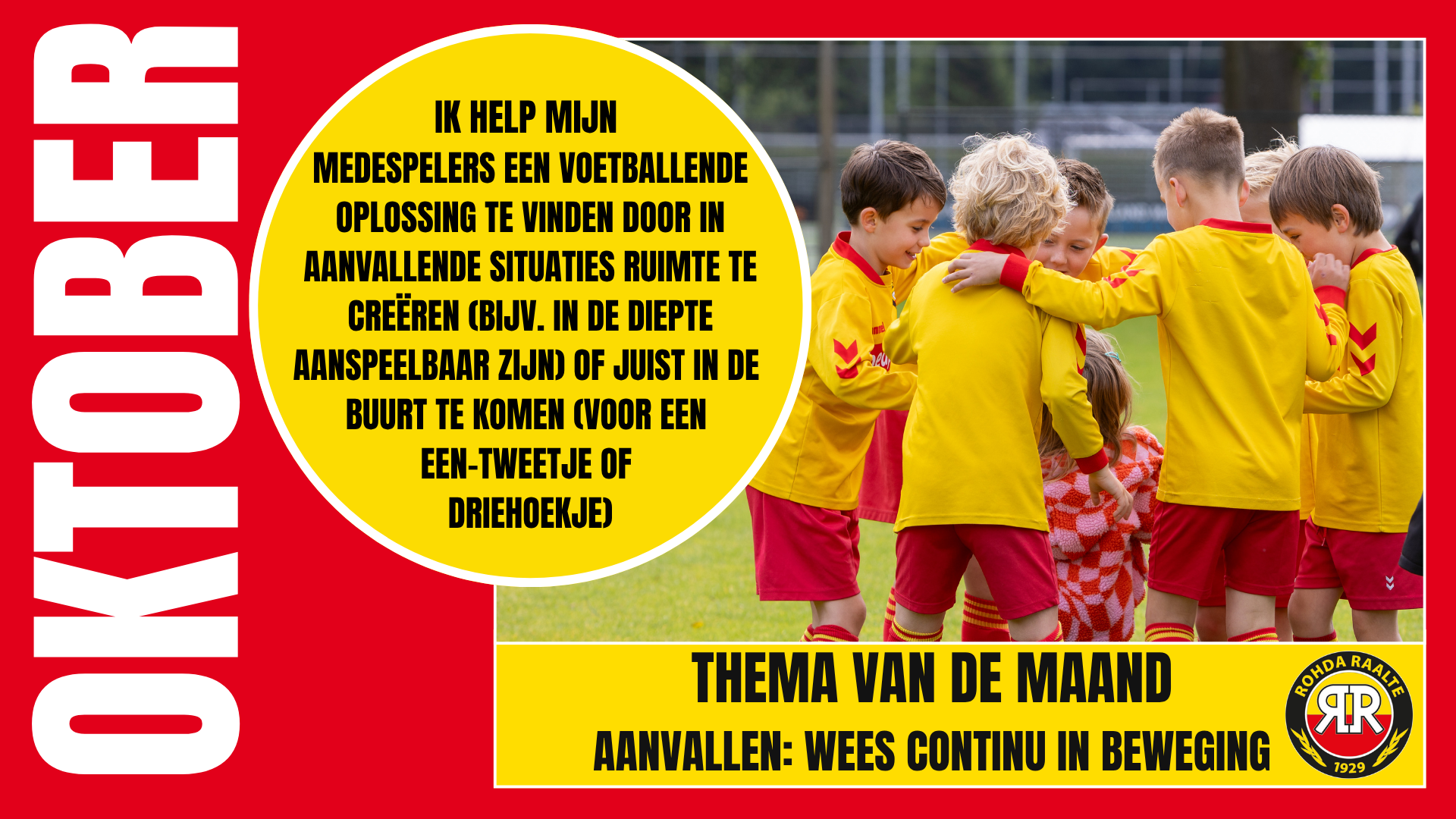 Randvoorwaardelijk zijn er dus veel stappen gezet. Waar we nog meer mee aan de slag moeten, is het voetbal zelf. Hoe kunnen we onze spelers en speelsters zo goed mogelijk opleiden? We delen onze voetbalvisie* en spelprincipes* met onze trainers en coaches. Maar de vertaalslag van deze ideeën naar het veld is niet altijd even makkelijk. Daarom hebben we afgelopen seizoen ‘Thema van de maand’ geïntroduceerd. Het jeugdkader ontvangt maandelijks coachopmerkingen, oefenstof en videobeelden. In de maand oktober staat het verdedigende thema ‘Continu in beweging’ centraal.