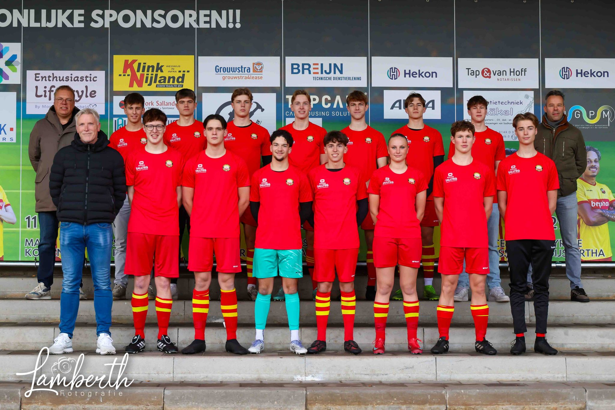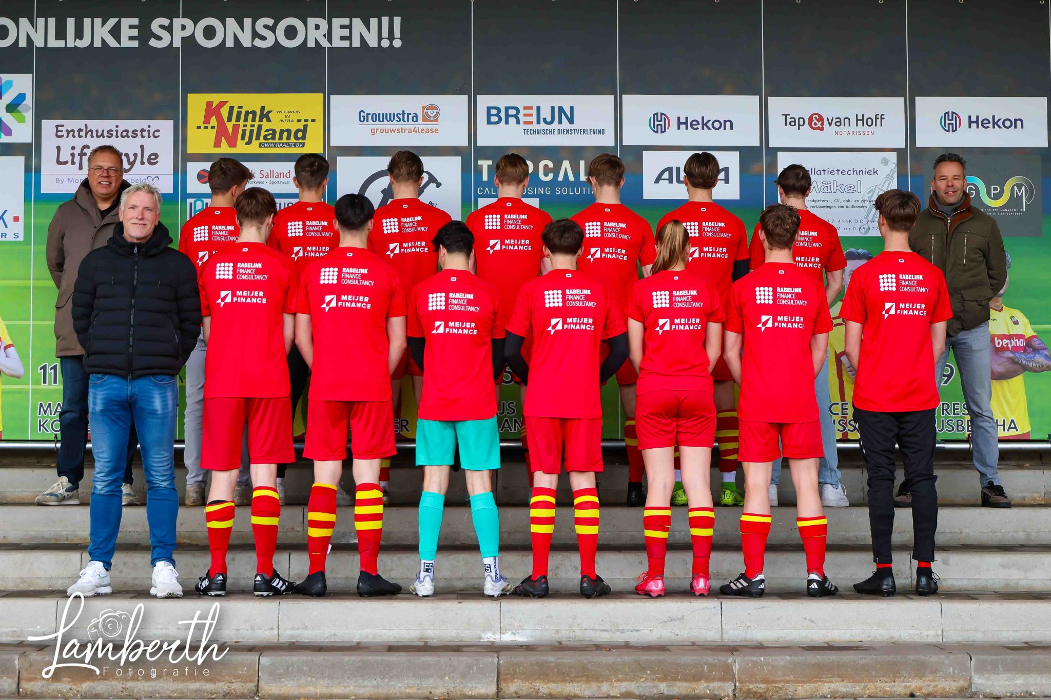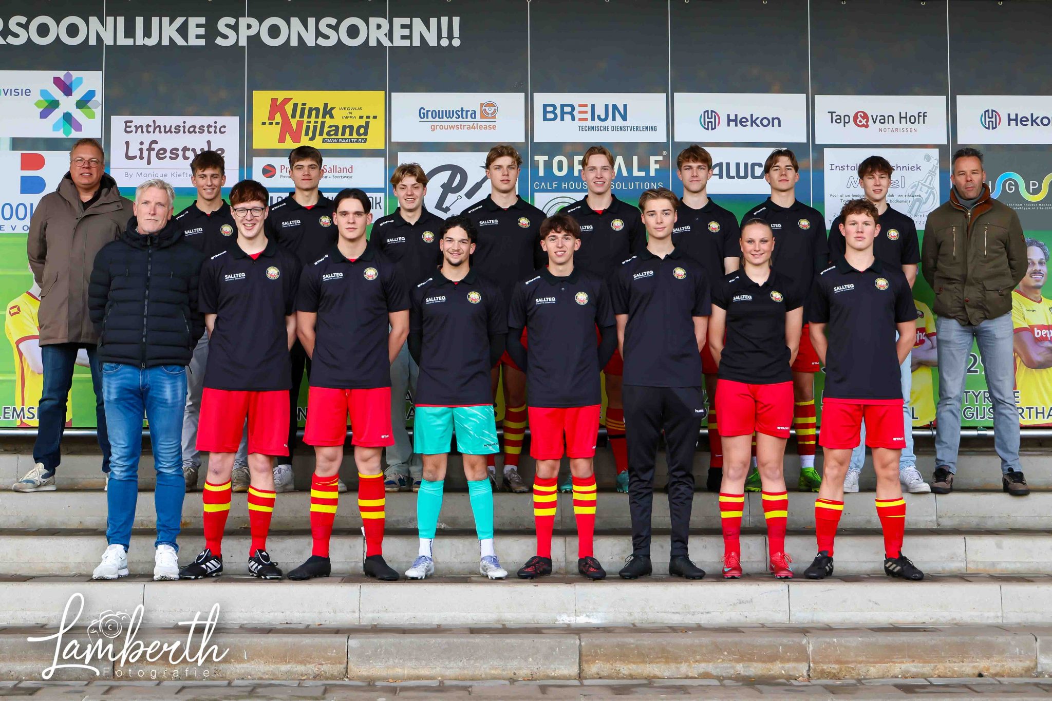Dankzij Sallteq, Rabelink Finance Consultancy, Meijer Finance en Less2Care zijn de jongens, de dame én het kader voorzien van prachtige inloopshirts en nette polo’s voor op de wedstrijddagen. En heeft het kader ook nog eens jassen ontvangen.