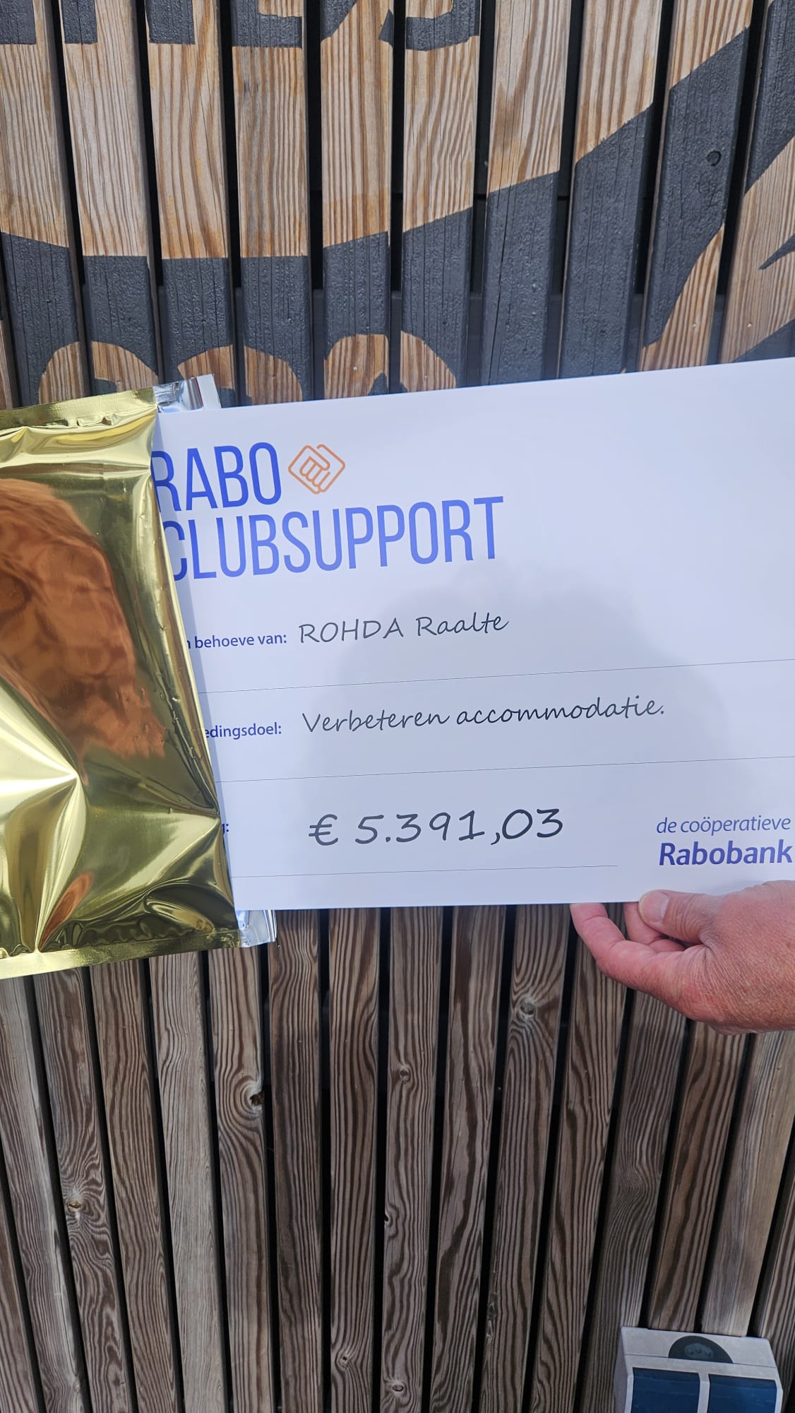 Dat dit een geweldig bedrag is, is duidelijk te zien aan de blije gezichten van Han en Monique, die al decennialang fanatiek ROHDA-supporter is. We gaan het gebruiken voor het verbeteren van de toegangspoort, het terrein voor de kantine en de opstelplaatsen voor de doelen. En mogelijk ook voor faciliteiten die we in de sporthal kunnen realiseren, zoals een spreek-/vergaderruimte.