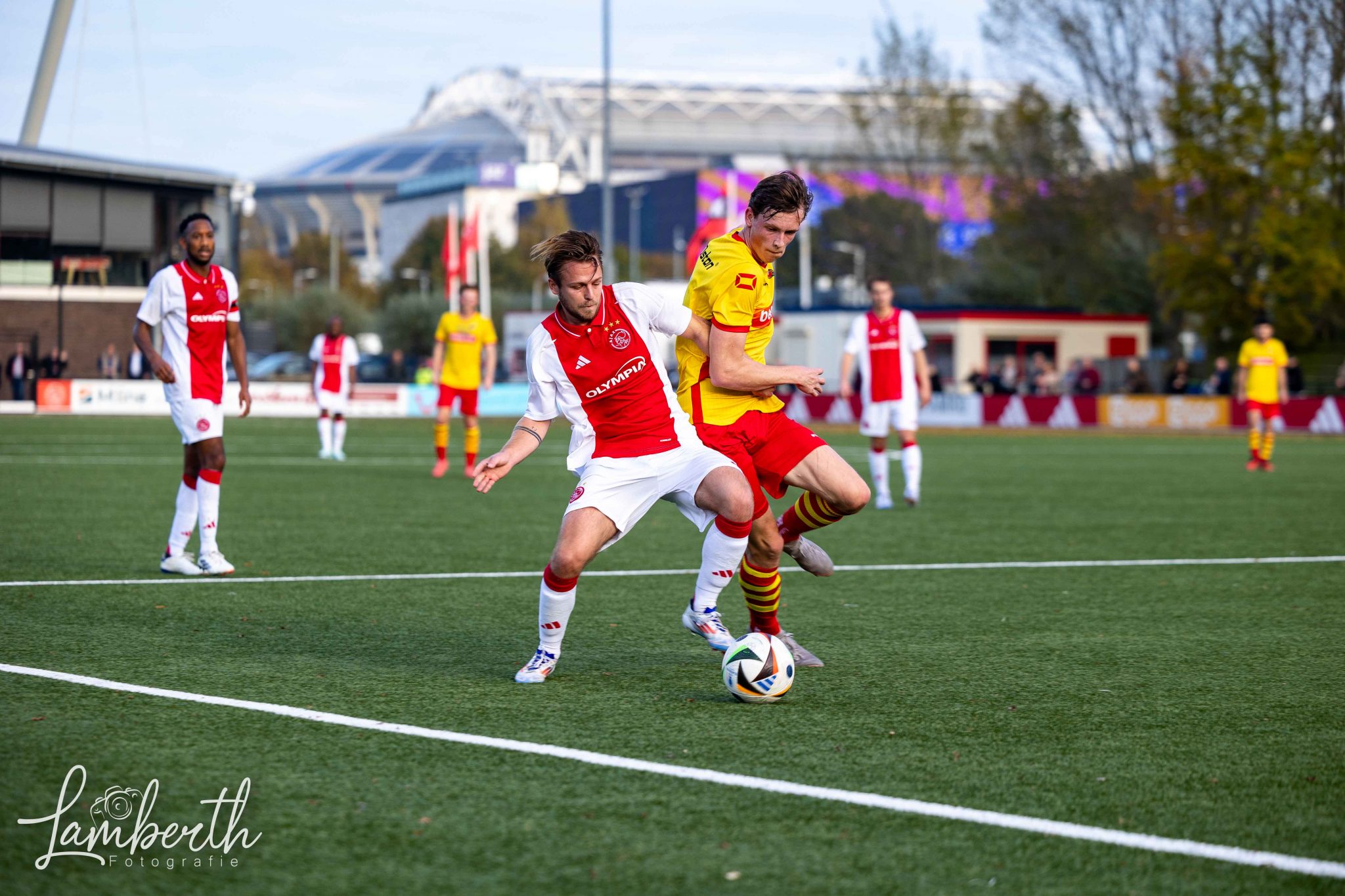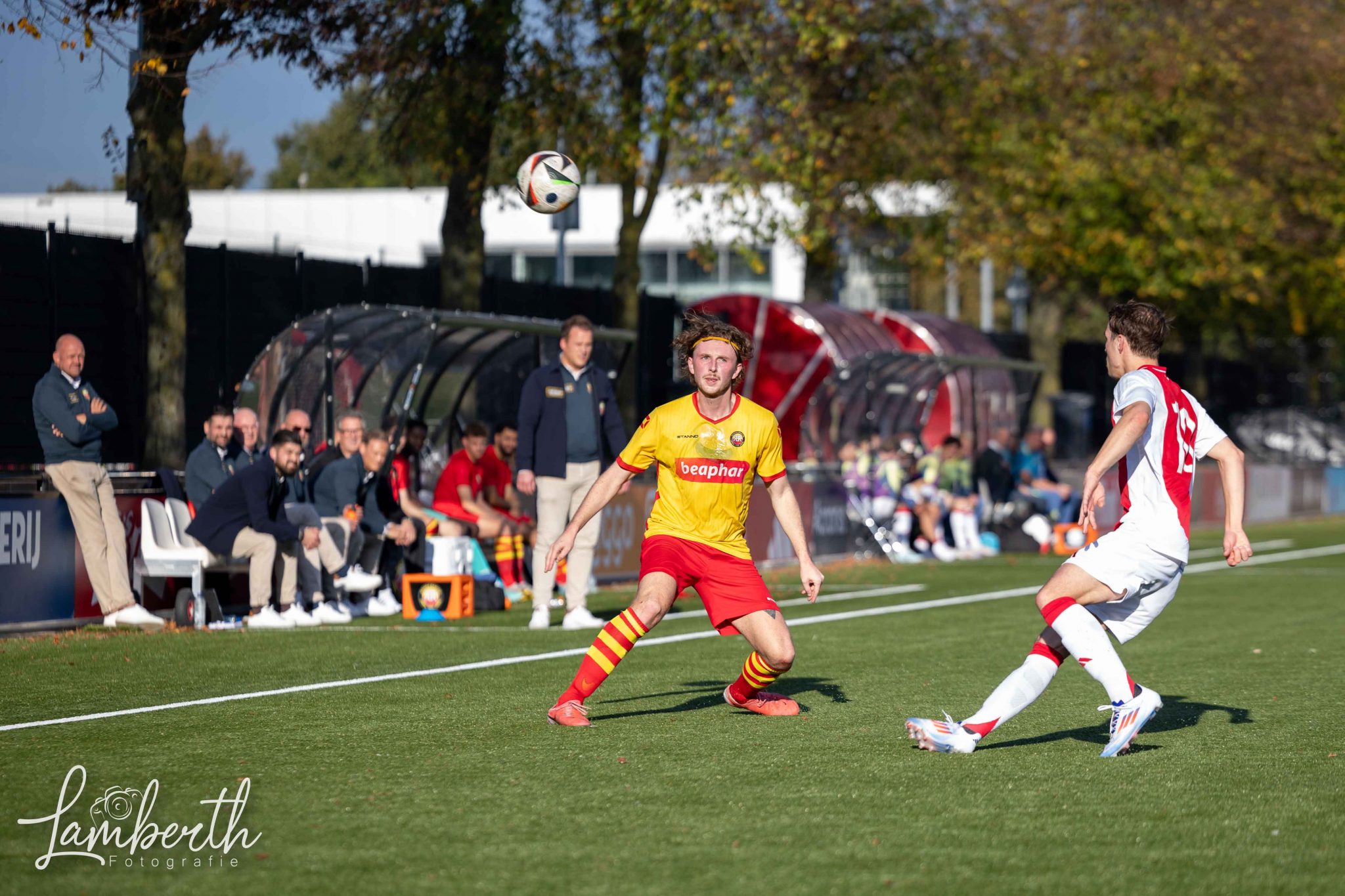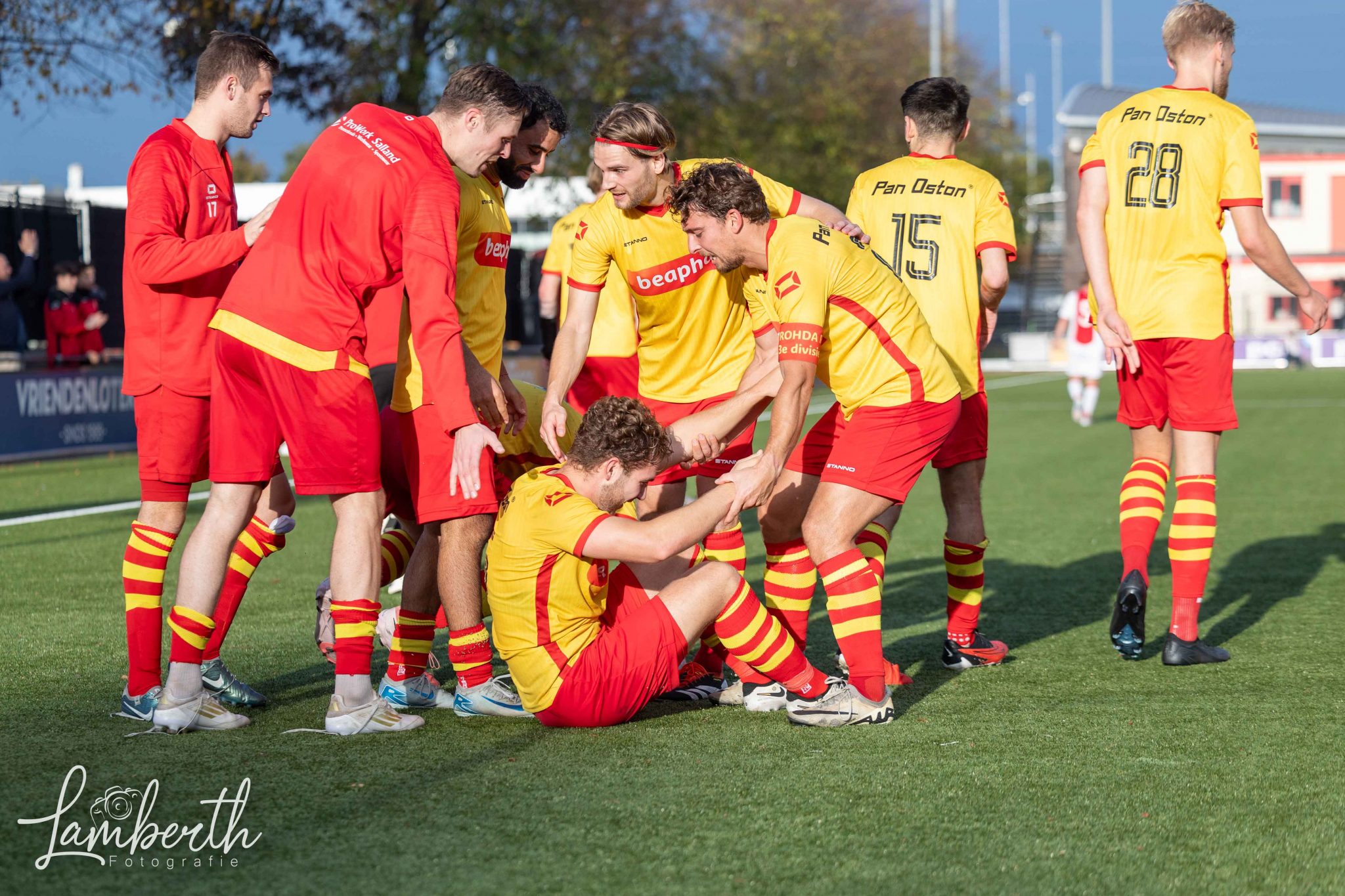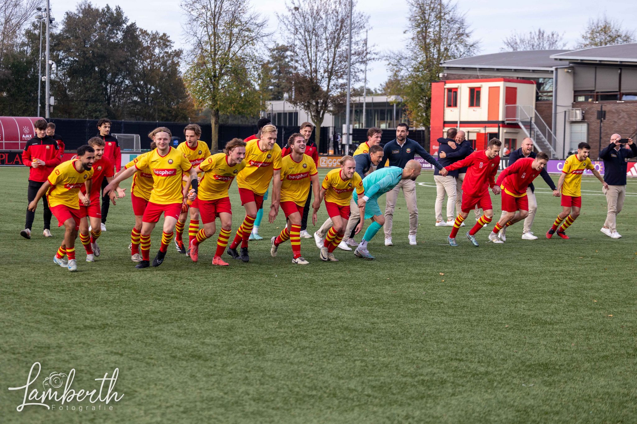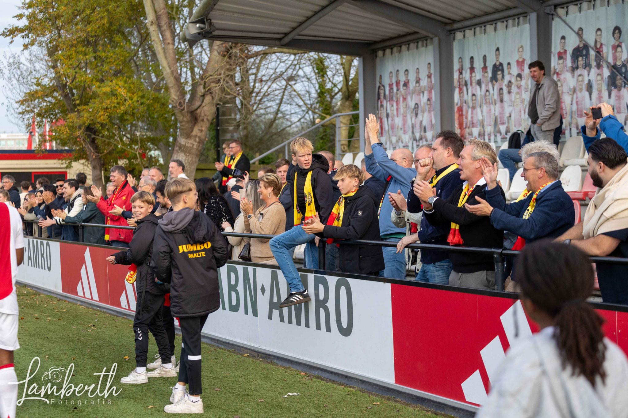 En dan waren ook nog eens zo'n kleine 100 meegereisde supporters (grotendeels met een speciaal geregelde supportersbus) getuige van deze prachtige overwinning! Ze gingen na het laatste fluitsignaal helemaal uit hun dak en zongen de spelers uit volle borst toe. En ook in de kantine was het nagenieten! Alwaar de aanwezige ras-Ajacied Sjaak Swart heel relaxt alle aandacht van fans over zich heen liet komen, gewillig poseerde voor menigeen die met 'm op de foto wilde, en met een glimlach op z'n gezicht het luidkeels gezongen Rohda-lied 'Als je rood-geel draagt' aanhoorde. In Amsterdam hebben ze geweten dat Rohda Raalte er was!