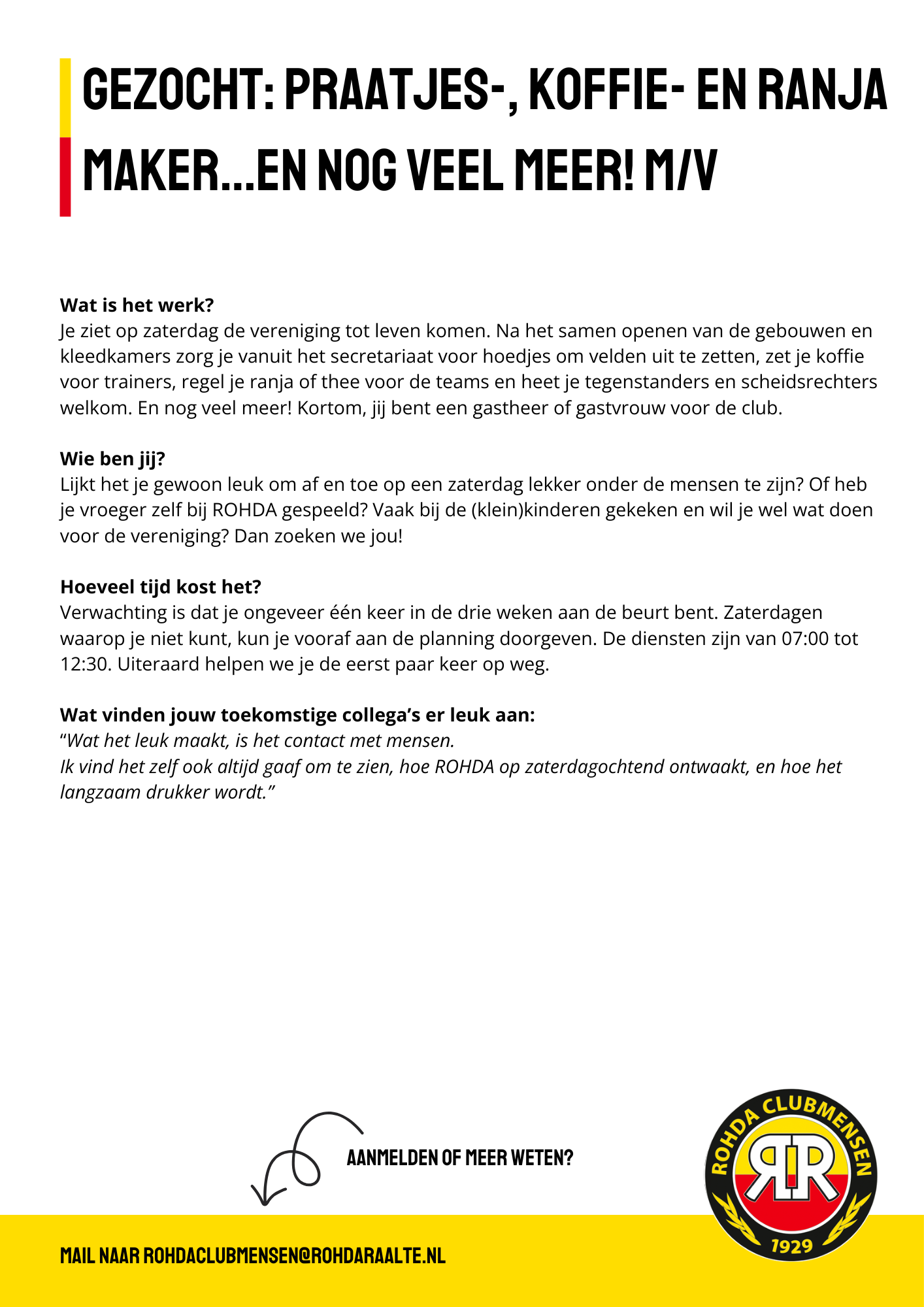 ROHDA Raalte zoekt gastheren en gastdames voor de zaterdag