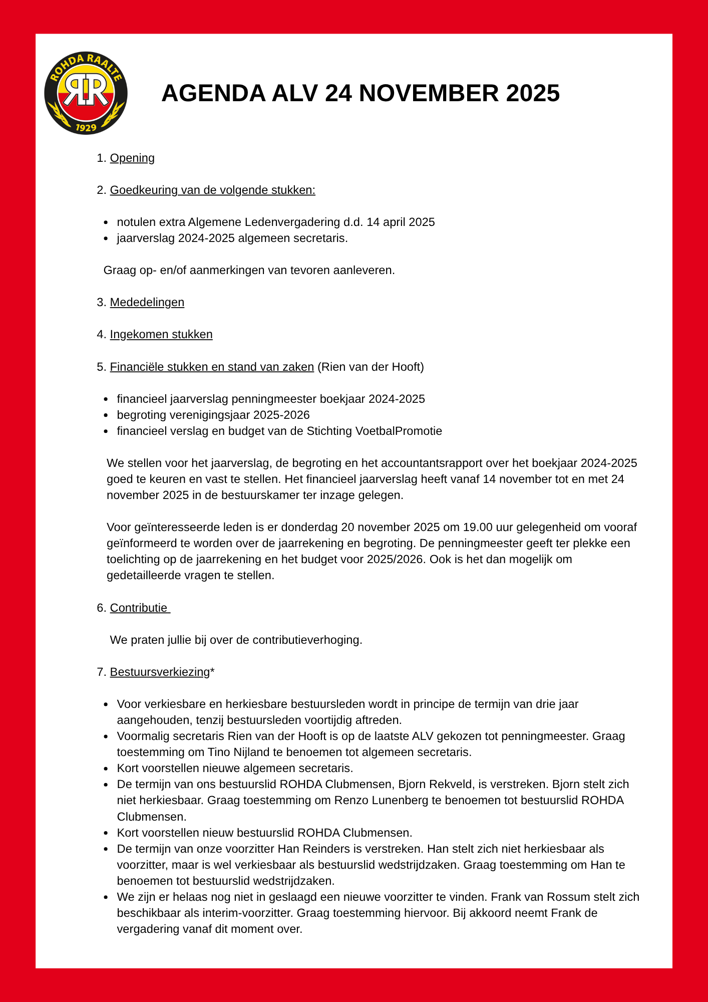 Beste leden, ereleden, donateurs en vrijwilligers van voetbalvereniging ROHDA Raalte,