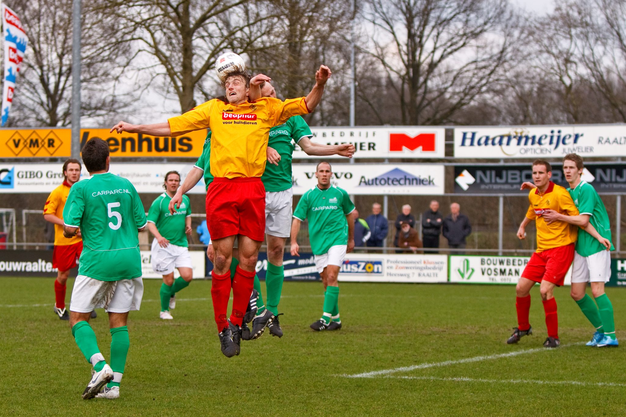 <Foto uit 2010: Bas Tuitert (broer van Olympisch schaatskampioen Mark Tuitert) kopt de bal door naar Sander Kok, topscorer Rohda Raalte jaren 2005-2012. Voor HSC'21 o.a. Hielke Penterman en Michael Dikken.>